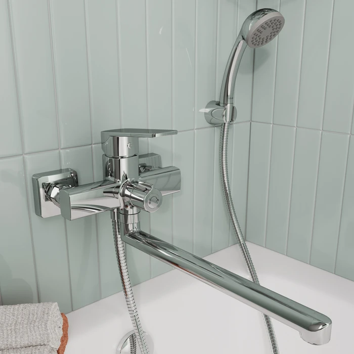 Смеситель Poli создан под проекты современных интерьеров: умеренно геометричные линии модели подойдут к сантехнике и мебели, как квадратных, так и скругленных форм. С длинным (29 см) изливом использовать пространство ванной получается намного эффективней, а поворотный излив позволяет охватить большую ее площадь.