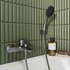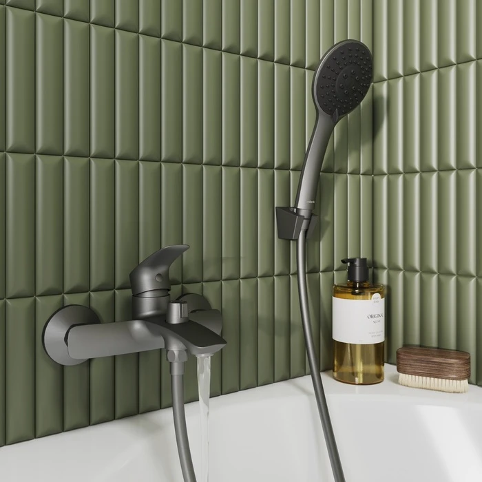 Смеситель для ванны Rora отличается универсальным характером: основной акцент в его дизайне приходится на плавные линии корпуса и трендовый графитовый цвет. Модель с коротким фиксированным изливом комфортна в ежедневном использовании, а интенсивность и температура потока воды легко регулируются удобной ручкой смесителя. Поворотный дивертор работает при любом давлении воды, переключая поток воды на большую душевую лейку ( 100 мм) или в комбинированном режиме.