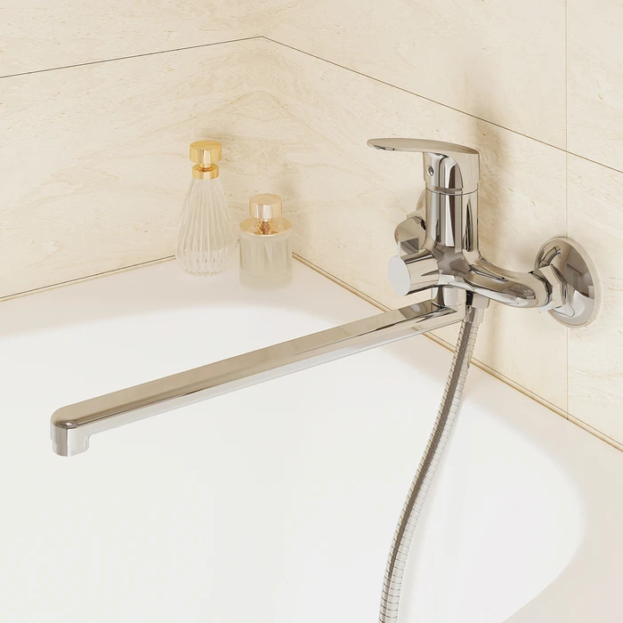 Смеситель для ванны Simp отличается простотой формы и естественной плавностью линий. Он подойдет для любого интерьера в классическом или современном стиле. Поворотный излив эстетично интегрирован в корпус, вода из него поступает в ванну под комфортным углом. В комплекте лейка для душа (67 мм), ПВХ-шланг (1,5 м) в оплетке из нержавеющей стали и держатель для лейки.