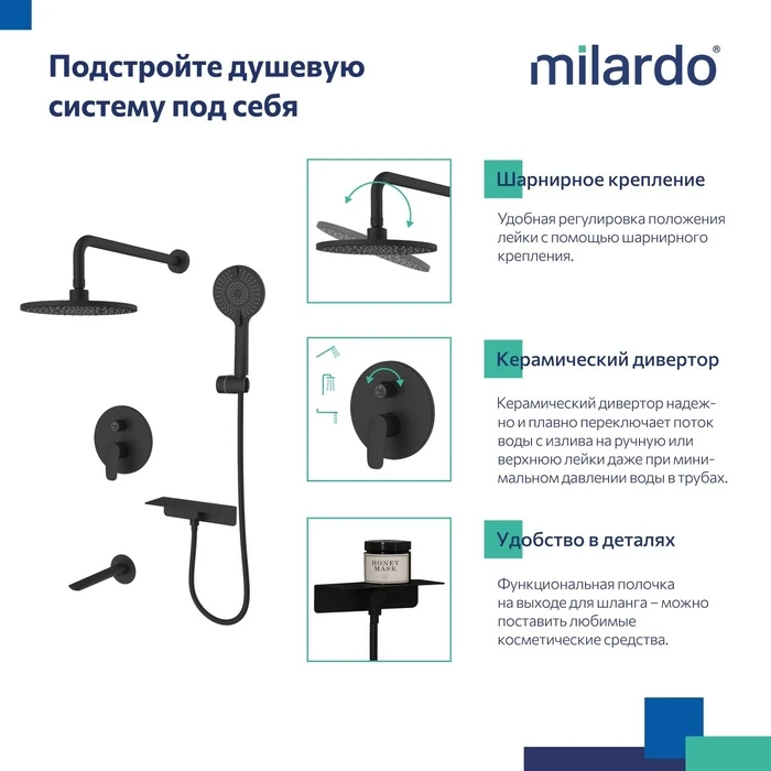 • Гарантия на душевую систему Milardo® – 7 лет, на водозапорный механизм – 3 года, на душевые аксессуары – 1 год.