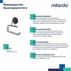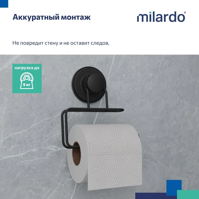 Бумагодержатель Milardo® монтируется специальным фиксатором на клеевой слой, дополнительно усиленный вакуумом, что увеличивает степень соприкосновения клеевой основы с поверхностью стены.