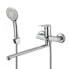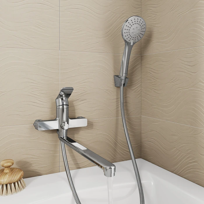 С длинным (35 см) изливом использовать пространство ванной получается намного эффективней, а поворотный излив позволяет охватить большую ее площадь. Поворотный дивертор работает при любом давлении воды, переключая поток воды с излива на большую душевую лейку ( 100 мм).
