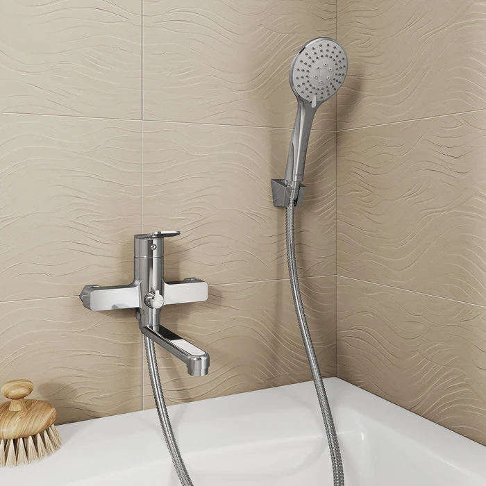 Смеситель с коротким (20 см) поворотным изливом позволяет использовать пространство ванной максимально эффективно, минимизируя количество брызг от потока воды. Привычный функционал у весьма компактной модели дает ощутимое преимущество смесителю Demi. Поворотный дивертор работает при любом давлении воды, переключая поток воды с излива на большую душевую лейку ( 100 мм).