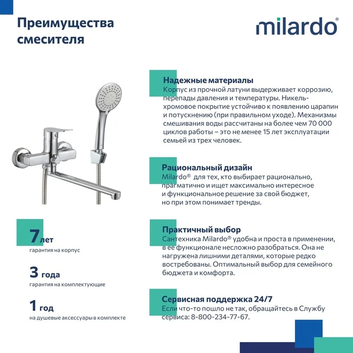 Гарантия на смеситель Milardo® – 7 лет, на картридж – 3 года, на душевые аксессуары – 1 год.