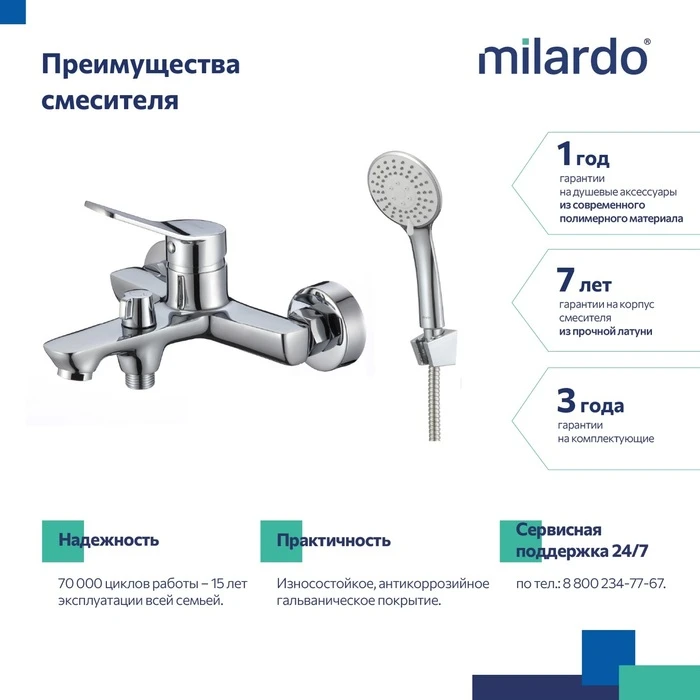 • Гарантия на смеситель Milardo® – 7 лет, на картридж – 3 года, на душевые аксессуары – 1 год.