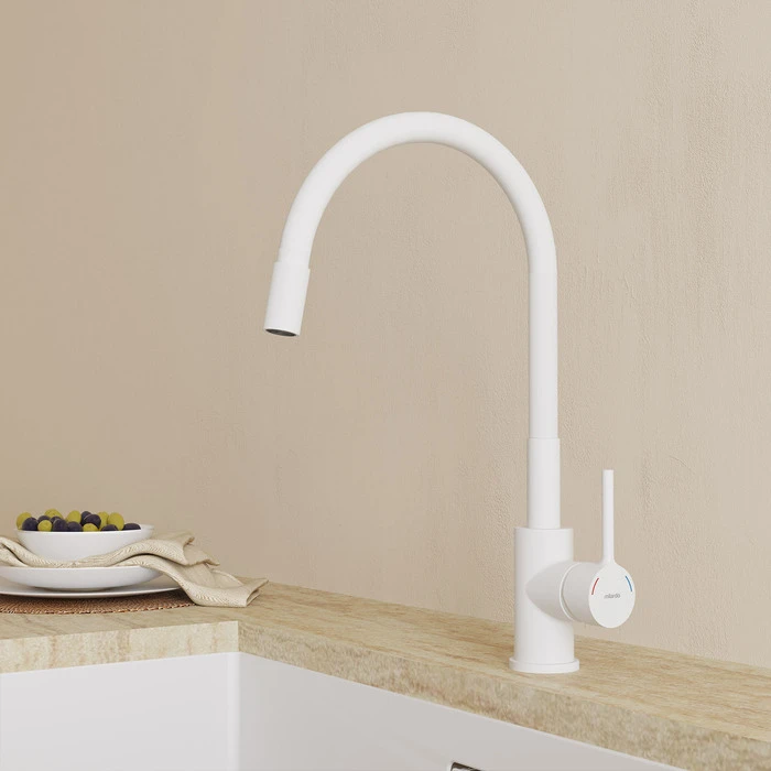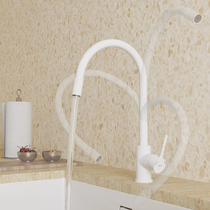 Белый смеситель Meal из цветной коллекции Meal – демократичное решение для современной кухни с высокой функциональностью. Гибкий излив позволяет менять направление потока, расширяя рабочую область смесителя.