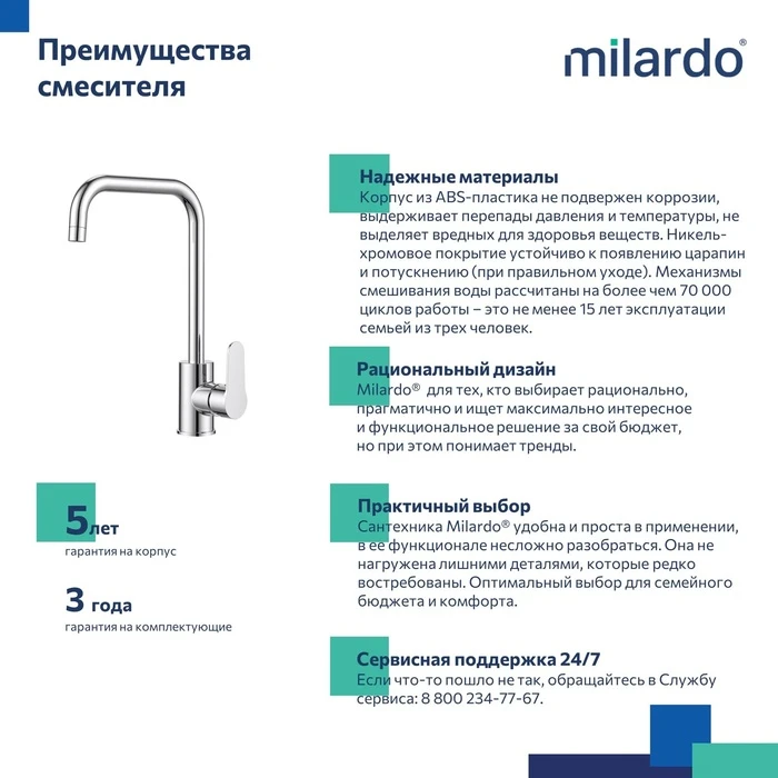 • Гарантия на смеситель Milardo® – 5 лет, на картридж – 3 года.