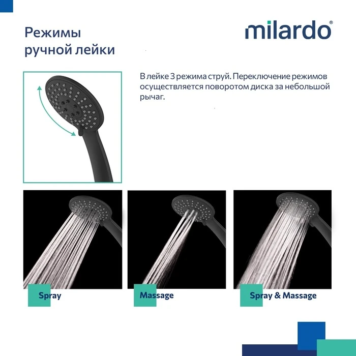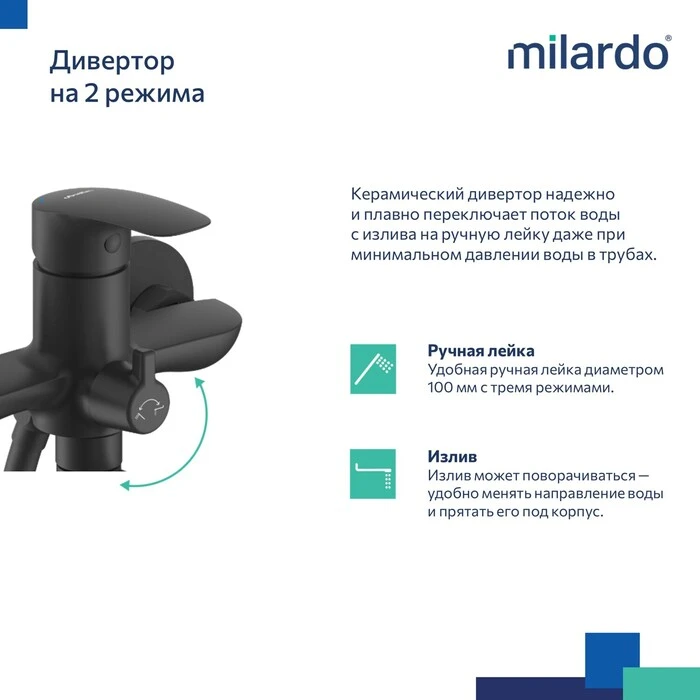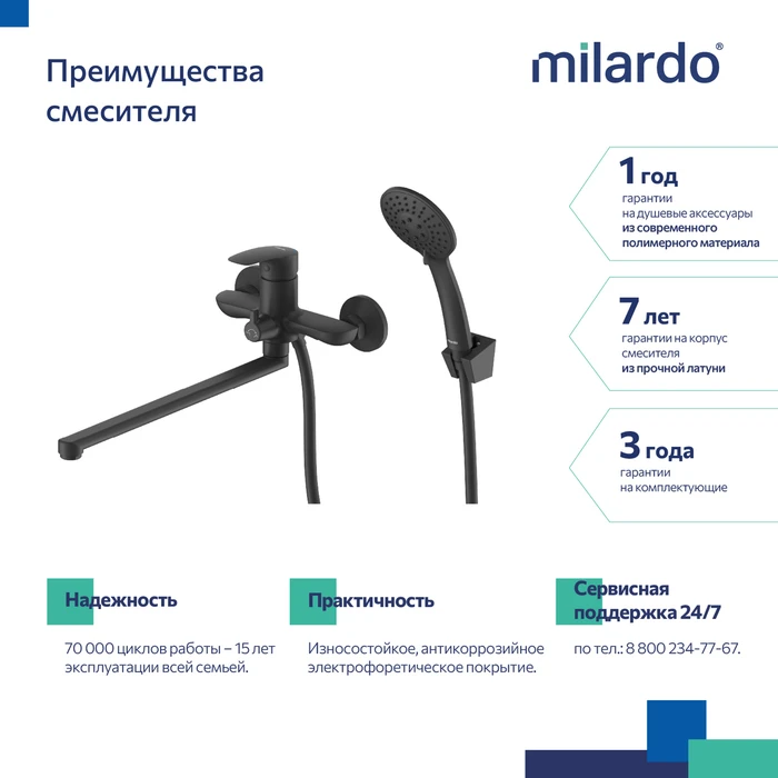 • Гарантия на смеситель Milardo® – 7 лет, на картридж – 3 года, на душевые аксессуары – 1 год.