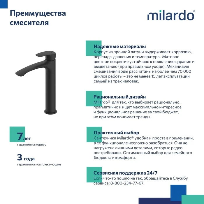 • Гарантия на смеситель Milardo® – 7 лет, на картридж – 3 года.