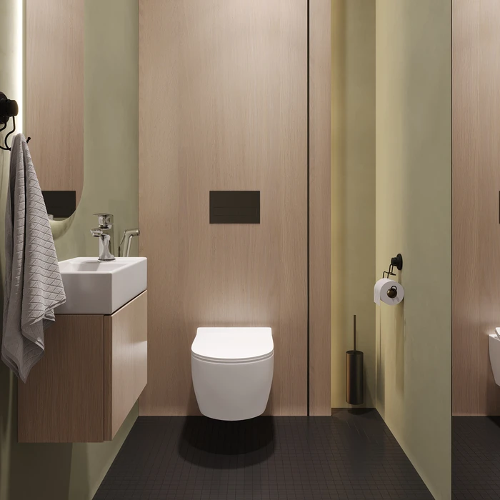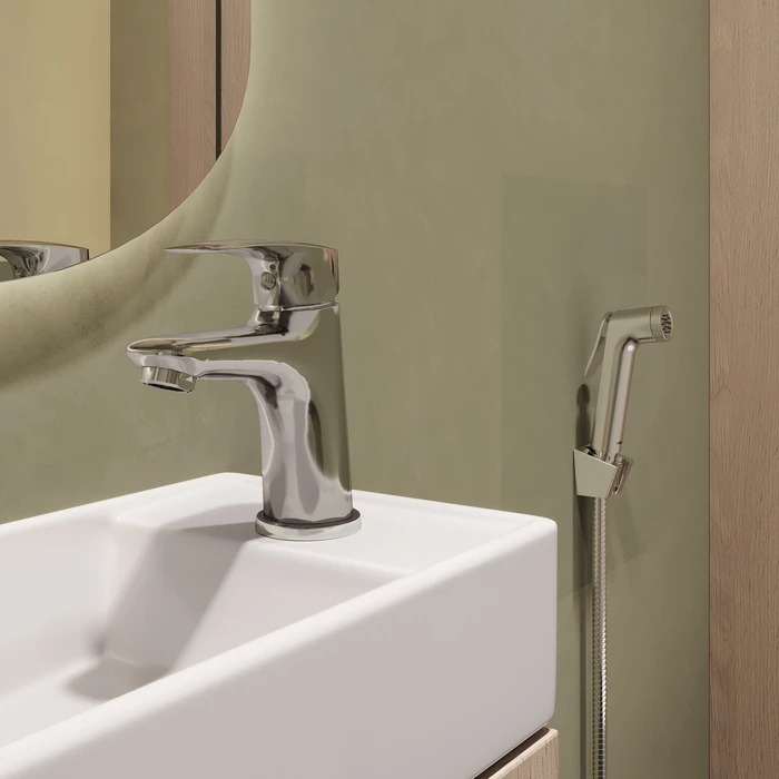 Смеситель с гигиеническим душем Rora отличается универсальным характером: основной акцент в его дизайне приходится на плавные линии корпуса.