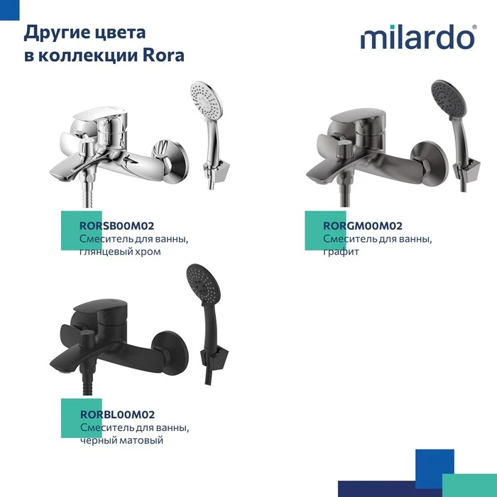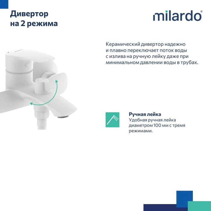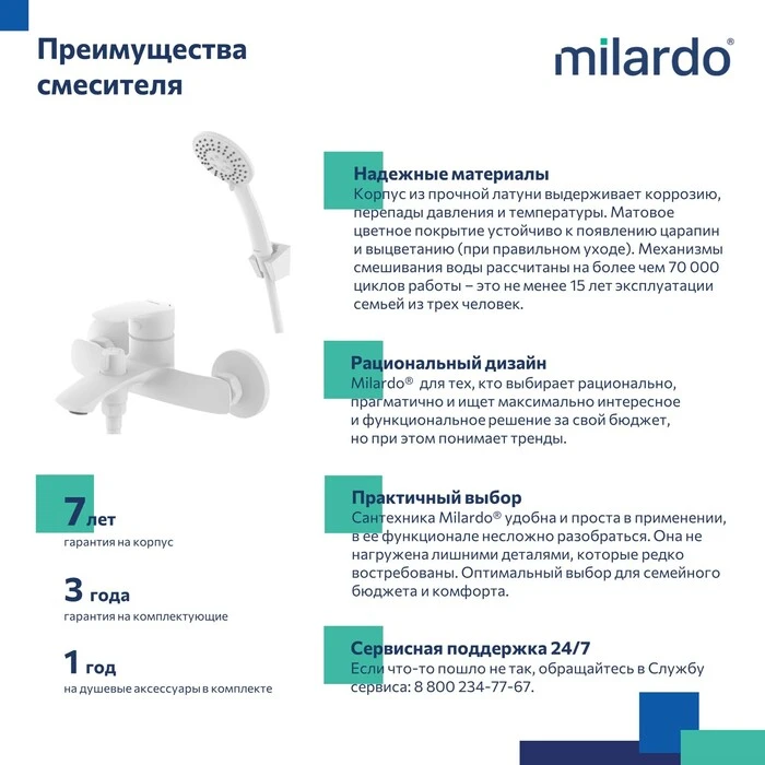 • Гарантия на смеситель Milardo® – 7 лет, на картридж – 3 года, на душевые аксессуары – 1 год.