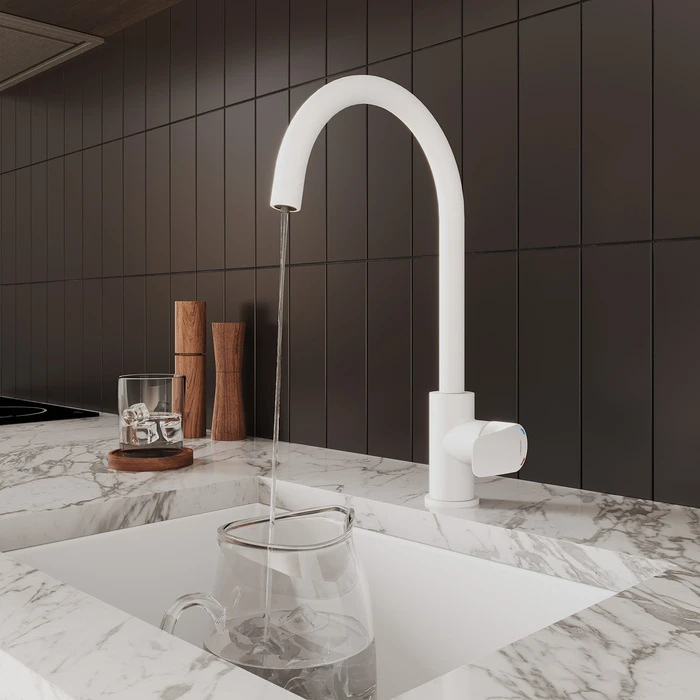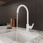 Смеситель для кухни Rora с отдельным каналом для фильтрованной воды отличается универсальным характером: основной акцент в его дизайне приходится на плавные линии корпуса и трендовый белый цвет. К нему можно подключить фильтр любого производителя и наслаждаться чистой водой прямо из смесителя. Переключение между режимами подачи воды осуществляется только одной ручкой. Модель не требует дополнительного отверстия в мойке под фильтр. Гибкая подводка и крепеж в комплекте.