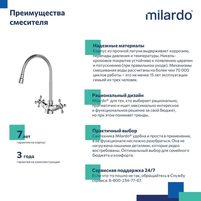• Гарантия на смесители Milardo® – 7 лет, картриджи и кранбуксы – 3 года.