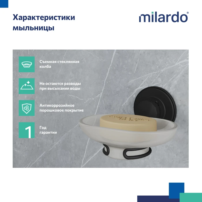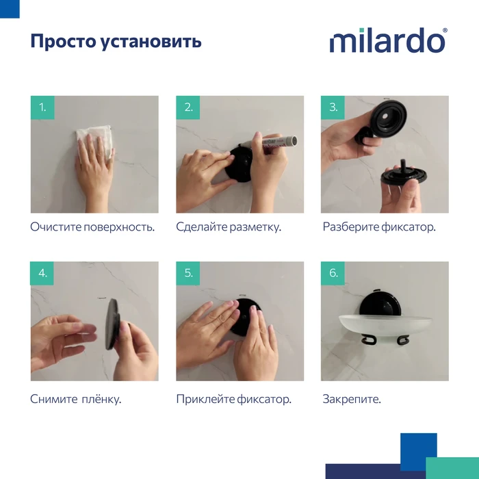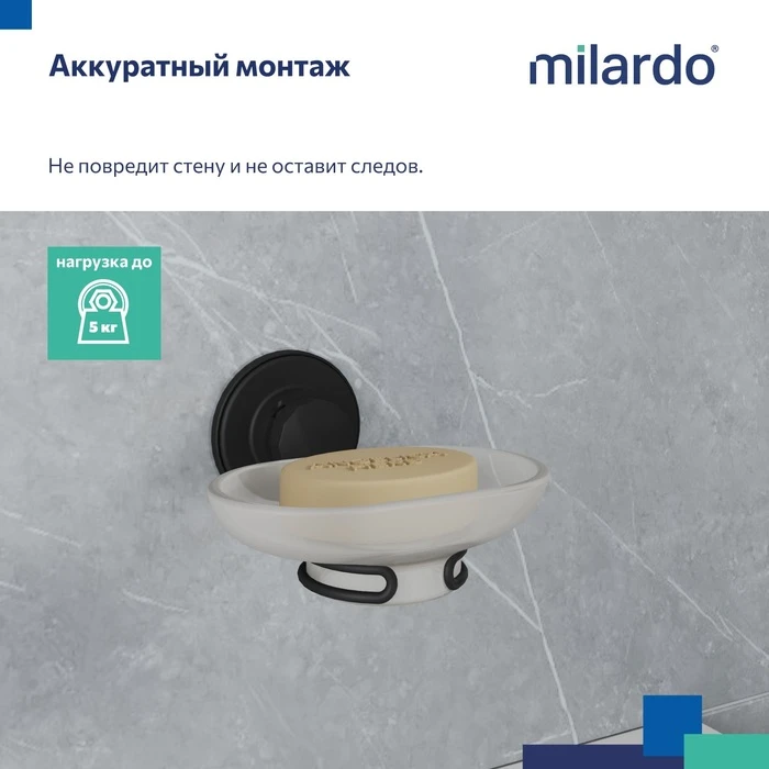 Мыльница Milardo® монтируется специальным фиксатором на клеевой слой, дополнительно усиленный вакуумом, что увеличивает степень соприкосновения клеевой основы с поверхностью стены.