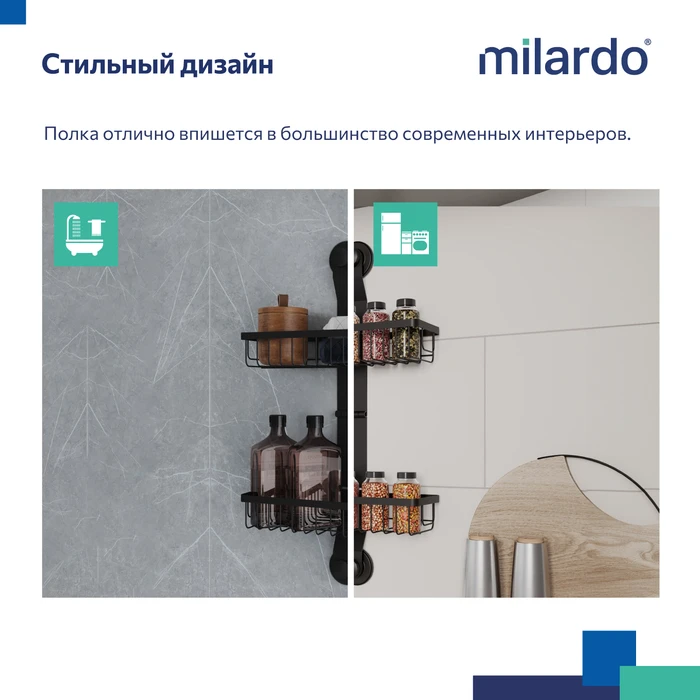 • В отличие от изделий из пластика полка Milardo® может выдерживать высокую (до 7 кг) нагрузку. Она монтируется без сверления, а значит можно не опасаться повредить красивую плитку или другое настенное покрытие.