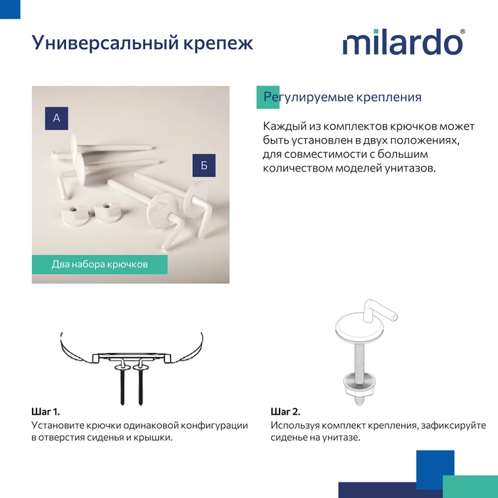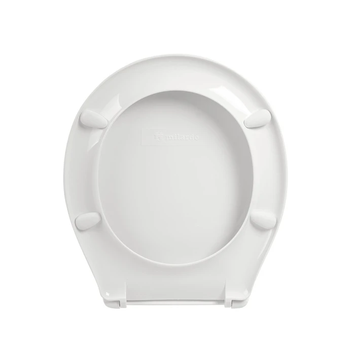Пластиковое сиденье Milardo® белого цвета из полипропилена с пластиковыми креплениями, входящими в комплект. Модель идеально подойдет для унитазов с округлой формой чаши, сужающейся к бачку.