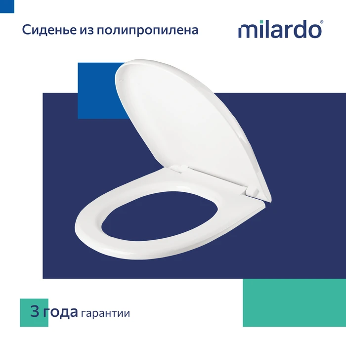 Пластиковое сиденье Milardo® белого цвета из полипропилена с пластиковыми креплениями, входящими в комплект. Модель идеально подойдет для унитазов с прямой чашей, широкой у бачка.