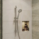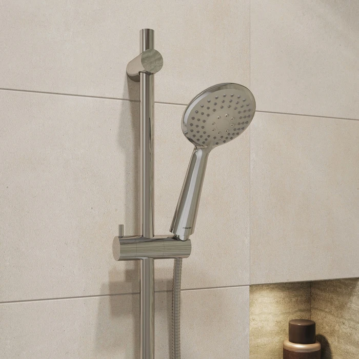 Стильная душевая лейка Essential хорошо сочетается с разными интерьерами современных ванных комнат. Благодаря анатомически удобной ручке её комфортно держать в руке. Дополнительный ряд форсунок делают процесс принятия душа еще более расслабляющим и приятным.