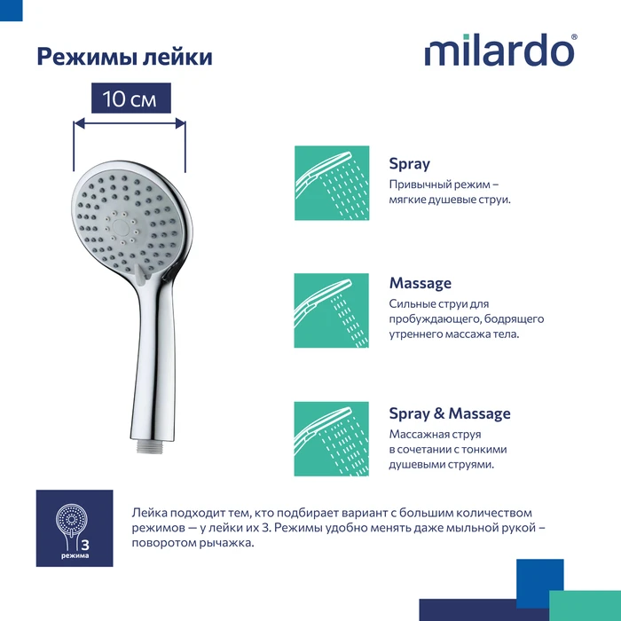 Подобрать вариант душа для релаксации или активного начала дня не составит никакого труда с 3 режимами управления потоком воды. Режимы переключаются с помощью слайдера на ручке.