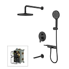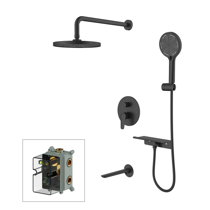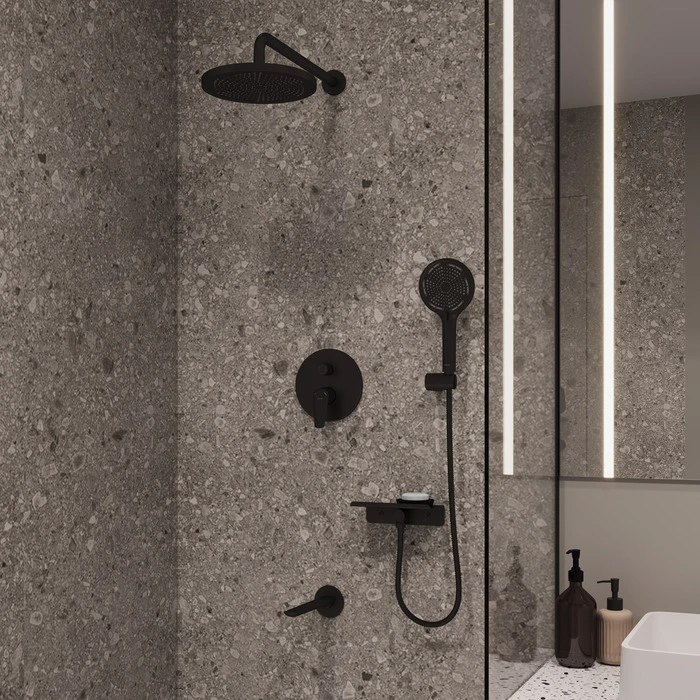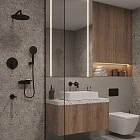 Коллекция Dale в черном цвете поможет создать пространство ванной комнаты, где нет ничего лишнего. Система скрытого монтажа на три выхода – универсальное решение: она подойдет для установки как в зоне с ванной, так и душевой зоне. Размещайте элементы душевой системы по своему усмотрению, реализуя самые стильные проекты. Все внутренние механизмы системы будут спрятаны внутри встраиваемого монтажного бокса, видимыми останутся только элементы управления.