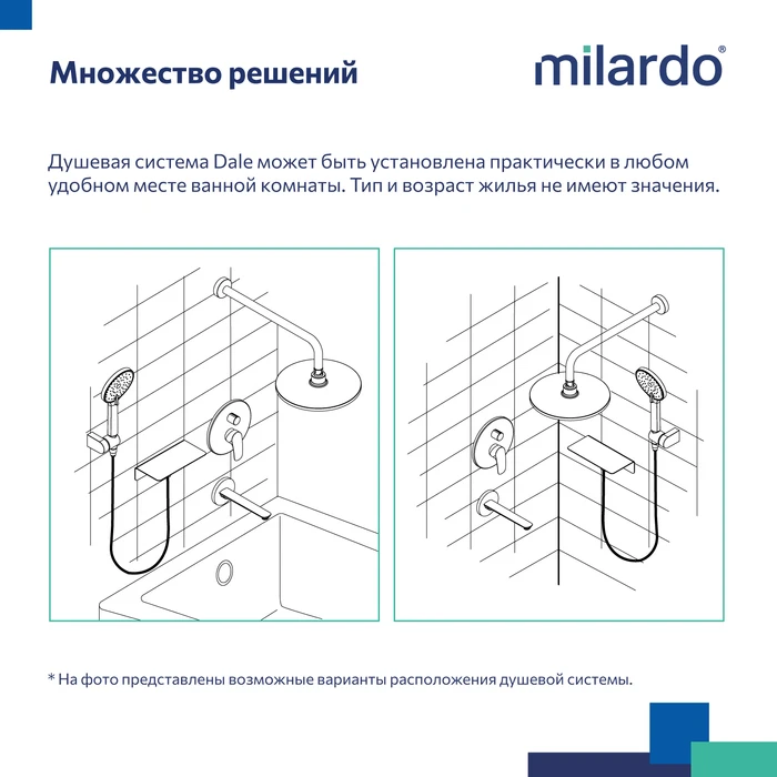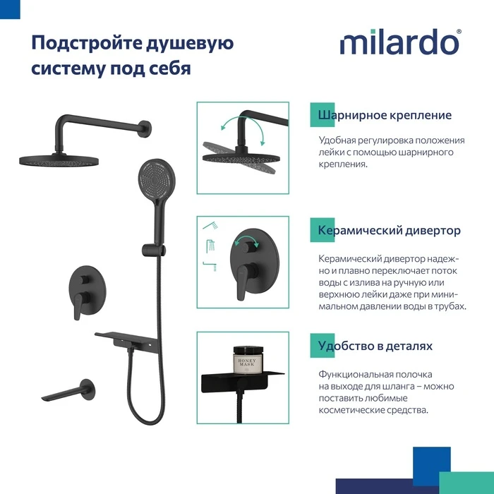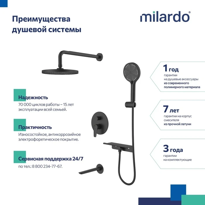 • Гарантия на душевую систему Milardo® – 7 лет, на водозапорный механизм – 3 года, на душевые аксессуары – 1 год.