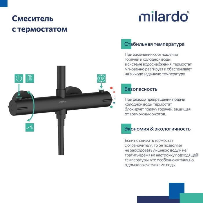 Черный смеситель Ideal Spa будет гармонично смотреться практически в любом ин-терьере ванной комнаты. Преимущество термостата над обычным смесителем – мгновенная реакция на лю-бые изменения в соотношении горячей и холодной воды в трубопроводе. При небольших перепадах темпе-ратура смешанного потока останется стабильной, а при внезапном отключении холодной воды, термостат полностью перекроет подачу горячей. Термостат уже настроен на максимально комфортную температуру (38 °C) для экономного потребления горячей воды, что особенно актуально в домах со счетчиками воды.