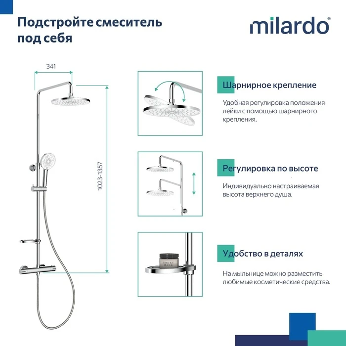• Интегрированный в корпус дивертор плавно переключает поток воды с излива на верхнюю лейку с эффектом домашнего СПА или 3-режимную ручную лейку.