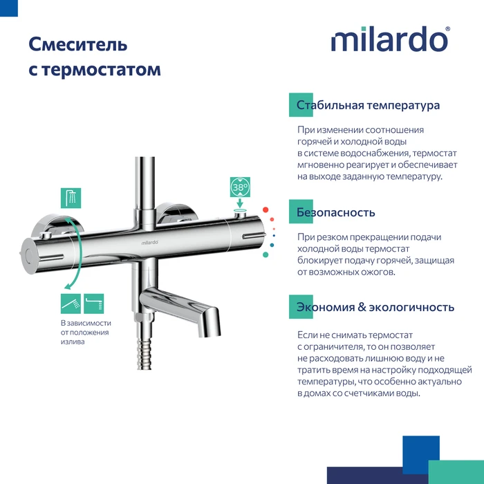 Смеситель Ideal Spa будет гармонично смотреться практически в любом интерьере ванной комнаты. Преимущество термостата над обычным смесителем – мгновенная реакция на любые изменения в соотношении горячей и холодной воды в трубопроводе. При небольших перепадах температура смешанного потока останется стабильной, а при внезапном отключении холодной воды, термостат полностью перекроет подачу горячей. Термостат уже настроен на максимально комфортную температуру (38 °C) для экономного потребления горячей воды, что особенно актуально в домах со счетчиками воды.