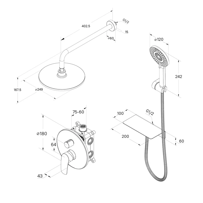 • В комплекте есть все, что нужно, чтобы начать пользоваться сразу: ПВХ-шланг (1,5 м), четырехрежимная ручная лейка, тропический душ и выход для шланга, оснащенный полочкой для размещения косметических средств.
