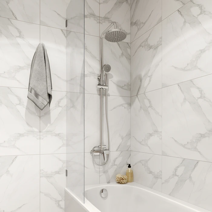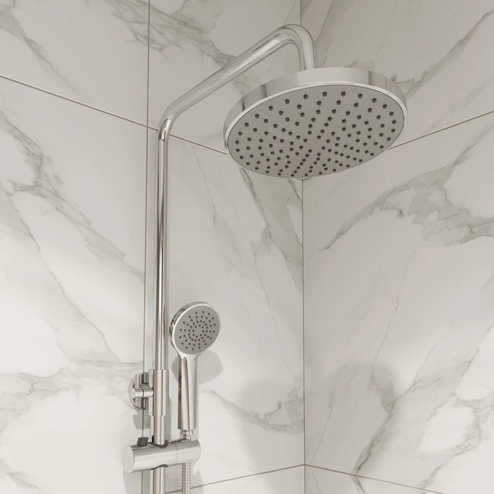 Поворотный керамический дивертор работает при любом давлении воды, переключая поток воды на верхнюю душевую лейку (диаметр – 200 мм), ручную лейку (диаметр – 100 мм) или в комбинированном режиме. В комплекте ручная лейка, гладкий душевой шланг (1,5 м) и все необходимое для установки смесителя.