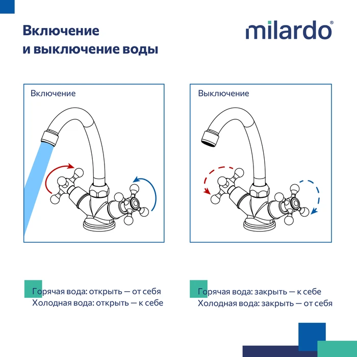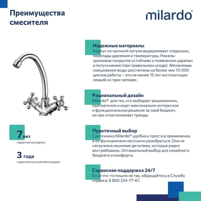 • Гарантия на смесители Milardo® – 7 лет, на водозапорные механизмы – 3 года.
