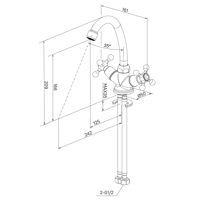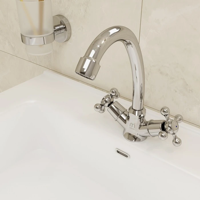 Смеситель для умывальника Duplex традиционного дизайна с удобными крестообразными ручками. Угол поворота ручек 180о обеспечивает точную регулировку температуры и напора воды, а термоизоляция не позволяет им нагреваться – взрослые и особенно дети защищены от случайных ожогов. В комплекте гибкая подводка и крепеж.