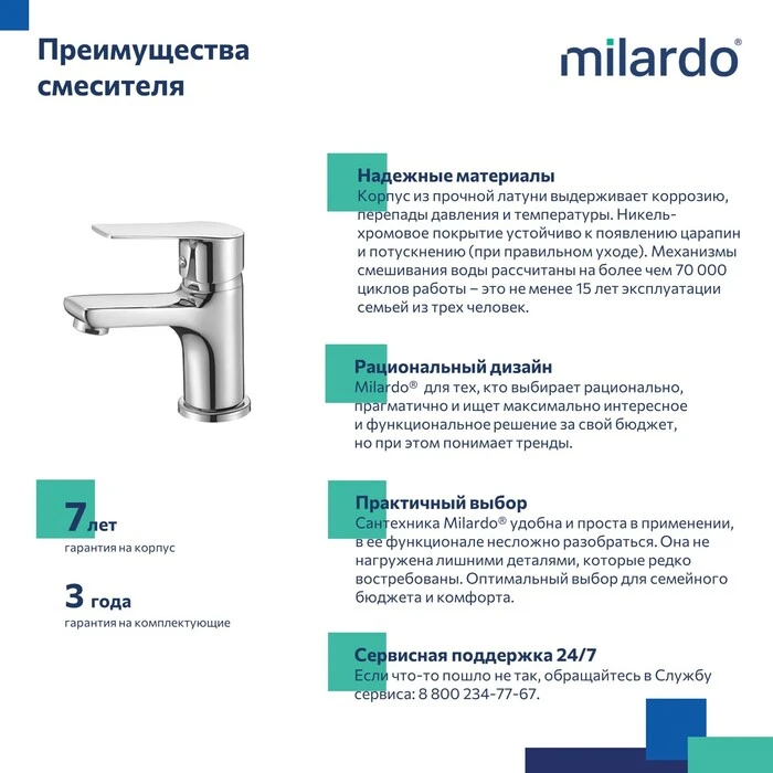 • Гарантия на смесители Milardo® – 7 лет.