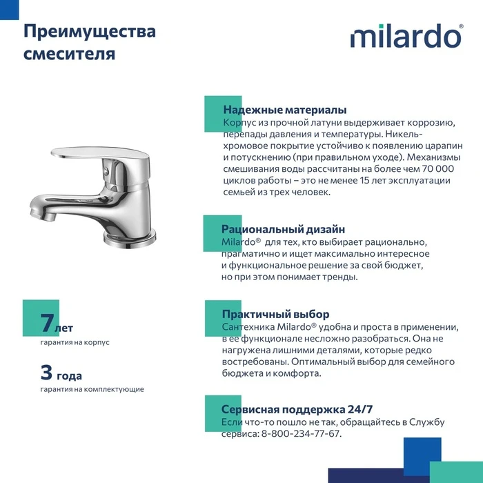 • Гарантия на смесители Milardo® – 7 лет, на картридж – 3 года.