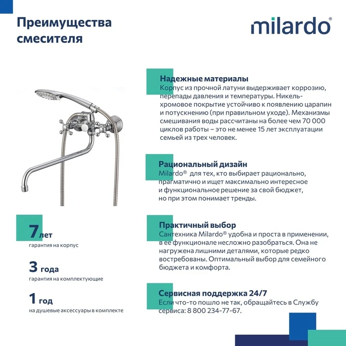 • Гарантия на смесители Milardo® – 7 лет, на душевые аксессуары – 1 год, на водозапорные механизмы – 3 года.