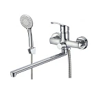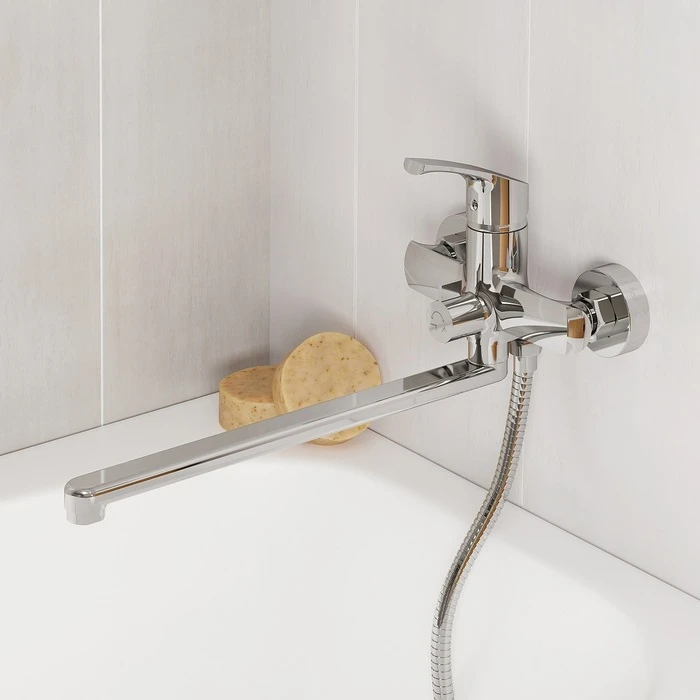 Смеситель для ванны Sterm в современном стиле с удобной ручкой округлой формы, что позволяет легко регулировать температуру и напор воды даже мыльной рукой. Поворотный излив эстетично интегрирован в корпус, вода из него поступает в ванну под комфортным углом. В комплекте лейка для душа (3 режима) с держателем, ПВХ-шланг (1,5 м) в оплетке из нержавеющей стали.