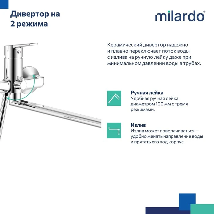 • Гарантия на смесители Milardo® – 7 лет, на душевые аксессуары – 1 год, на картридж – 3 года.