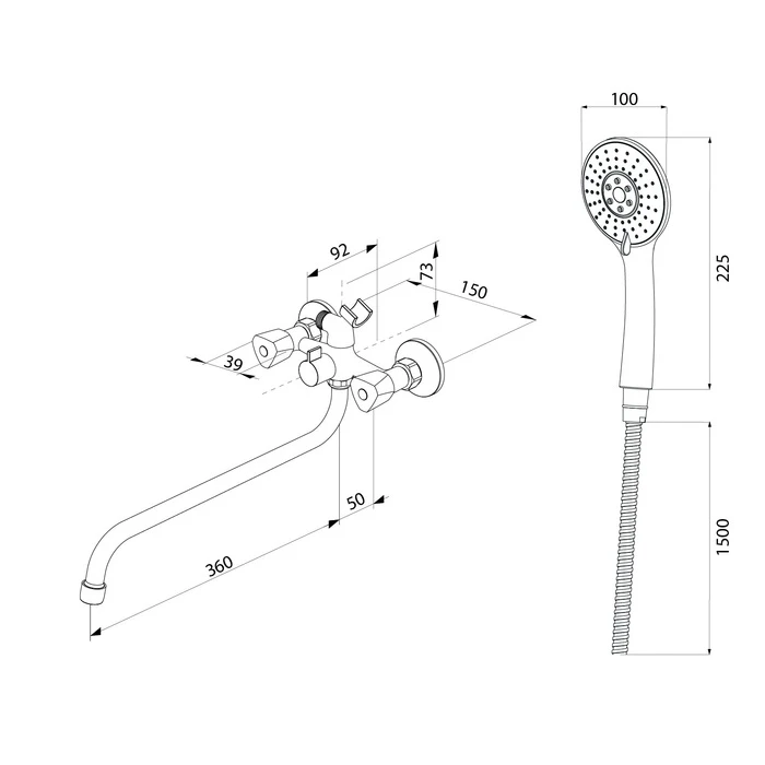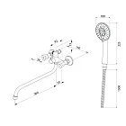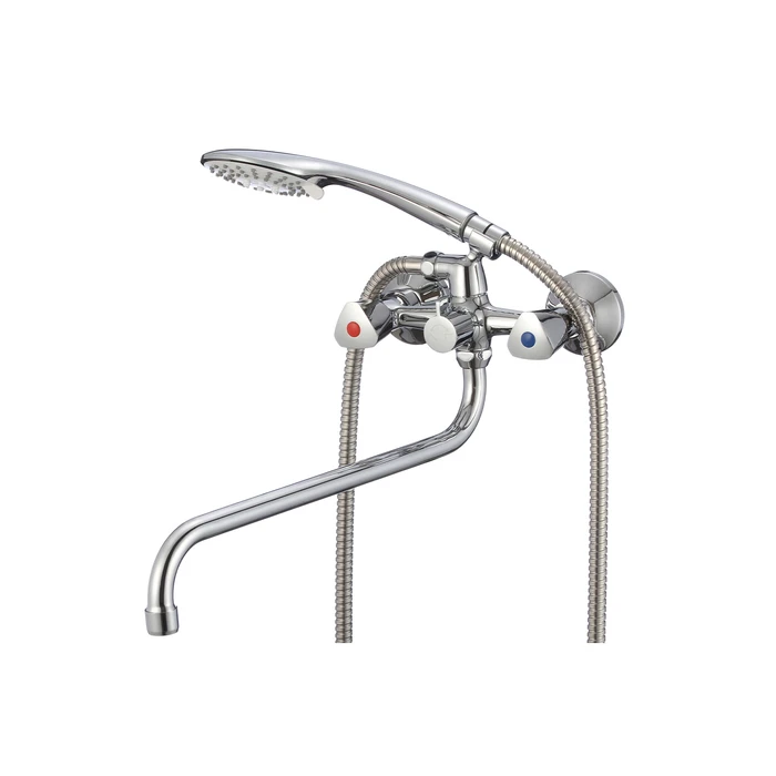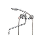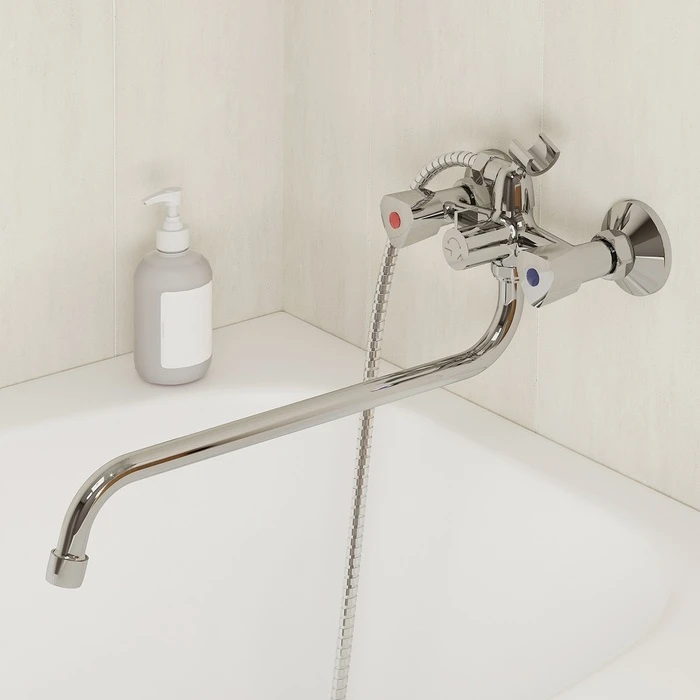 Длинный (350 мм) изогнутый излив делает смеситель удобным как для купания, так и для уборки или стирки. Лейка для душа (3 режима) с держателем, ПВХ-шланг (1,5 м) в оплетке из нержавеющей стали и крепеж идут в комплекте.