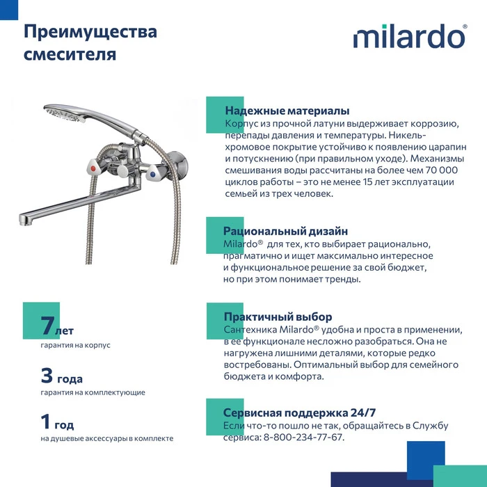 • Гарантия на смесители Milardo® – 7 лет, на кран-буксы – 3 года, на душевые аксессуары – 1 год.