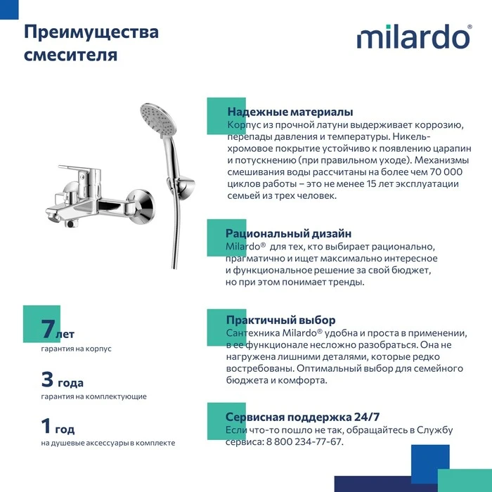 • Гарантия на смесители Milardo® – 7 лет, на душевые аксессуары – 1 год, на картридж – 3 года.