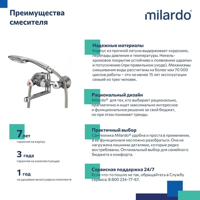 • Гарантия на смесители Milardo® – 7 лет, на кран-буксы – 3 года, на душевые аксессуары – 1 год.